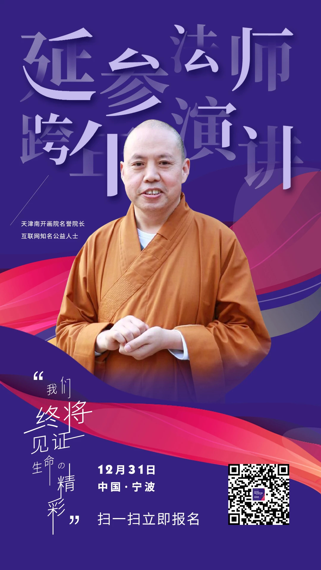 上蒼給了我們生命,其實也就給了我們?nèi)?。生命本身能夠?chuàng)造一切,包括創(chuàng)造一路艱難,以及克服艱難的能力。經(jīng)過漫長歲月,仍能保持善良、樂觀的天性,那就是生命的最高精彩。2020年12月31日跨年之夜,延參法師就將現(xiàn)身寧波,為你親口講述他眼中的生命精彩與幸福之道,現(xiàn)場還將隨贈延參法師親筆畫作一幅、手寫“?!弊忠粡堃约坝H筆簽名書一本作為對每一位來賓的新年祝福。屆時也會有抖音線上同步直播,同百萬網(wǎng)友一起迎接2021年的到來!