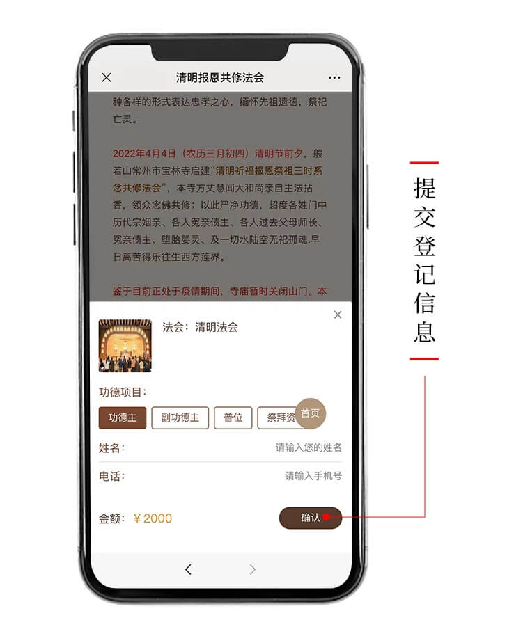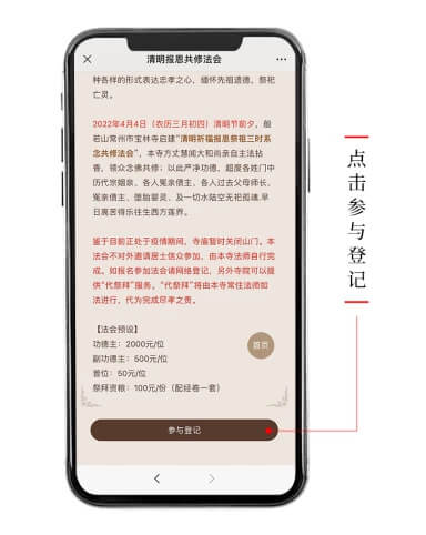 (4)點(diǎn)擊“全年法會(huì)”,例如您想?yún)⒓印扒迕鞣〞?huì)”,便可點(diǎn)擊“參與登記”,選擇功德項(xiàng)目后登記姓名、電話等信息,按“確認(rèn)”按鈕提交登記信息即可。