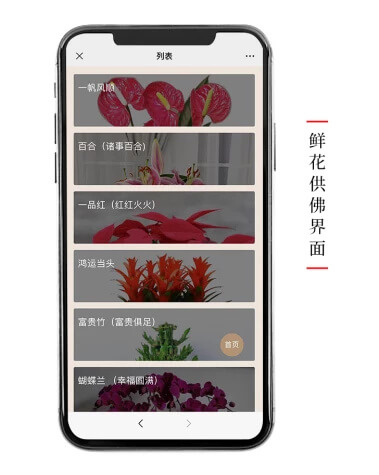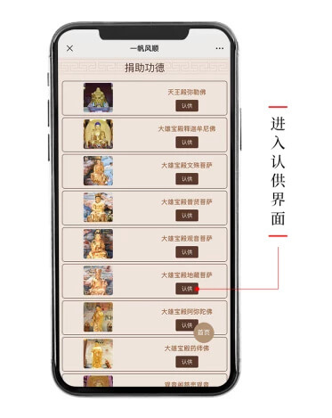 (6)例如您想“鮮花供佛”,點(diǎn)擊 “鮮花供佛”按鈕進(jìn)入鮮花供佛頁面,選擇您心儀的選項(xiàng)點(diǎn)擊進(jìn)入界面進(jìn)行登記,例如選擇“一帆風(fēng)順”,點(diǎn)擊按鈕后進(jìn)入認(rèn)供界面,進(jìn)行選擇認(rèn)供。