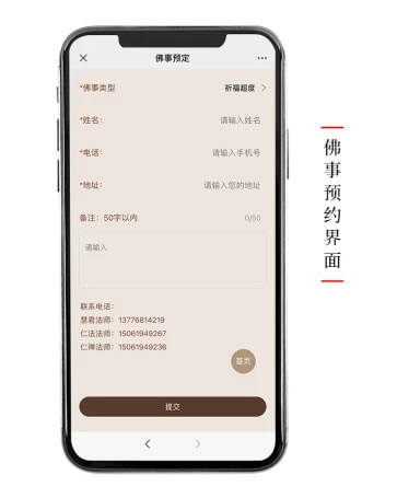 (5)例如您想【佛事預(yù)定】,點(diǎn)擊【寺院微站】首頁的【佛事預(yù)定】按鈕,進(jìn)入佛事預(yù)定界面,選擇佛事類型、填寫姓名、電話、地址,確認(rèn)信息無誤后按“提交”按鈕即可。