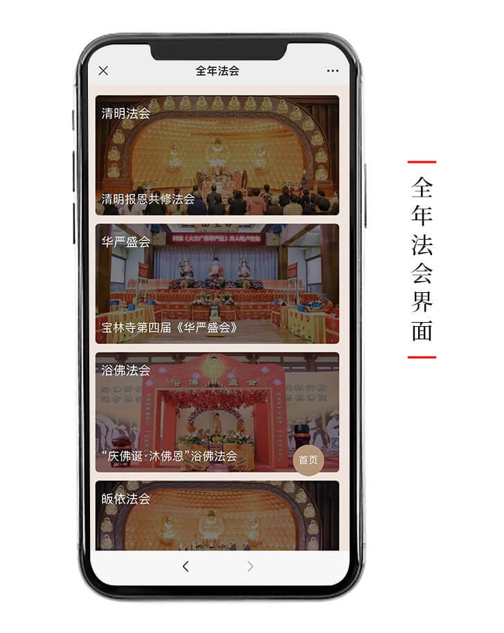 (3)首頁包含“全年法會(huì)”、“佛事預(yù)定”、“建寺功德”、“日行一善”、“鮮花供佛”、“供燈禮佛”、“助經(jīng)經(jīng)書”、“放生法會(huì)”等板塊。