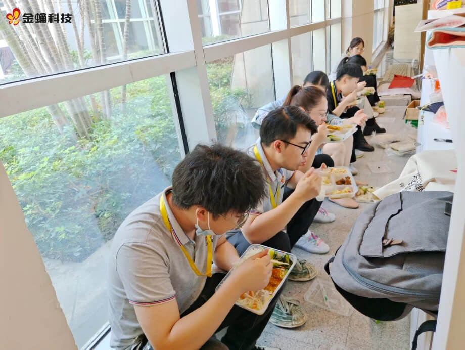 由于金蛹的智能產(chǎn)品在展會上引人注目,每天都有很多法師蒞臨,小伙伴們忙著接待,經(jīng)常顧不上吃飯。他們就趁著人流量不是很大時錯峰吃飯,捧著盒飯坐在窗邊的地上,囫圇吃完,接著工作。