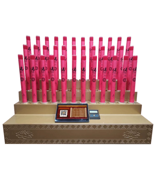 智能點(diǎn)香機(jī)的點(diǎn)亮以一對為單位,總計(jì) 18 對。以每排 6 對供香分為 3 排。其中供香高 44 厘米,直徑達(dá)到 4 厘米。祈福香內(nèi)置精油瓶,一點(diǎn)亮就會自動加熱霧化,營造一種煙霧升起的感覺。點(diǎn)香機(jī)無明火無公害,更能起到環(huán)保安全的作用。